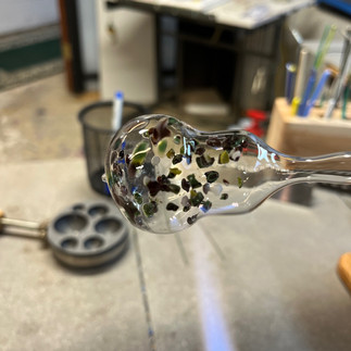 We added frit to the glaskolben when it was still cold, then warmed up the bulb in the flame. Eventually, the bulb is hot enough that the frit starts to stick to the edges. Once the bulb is glowing hot, you blow in the cold end and blow a bubble. Easy peazy. Sort of.